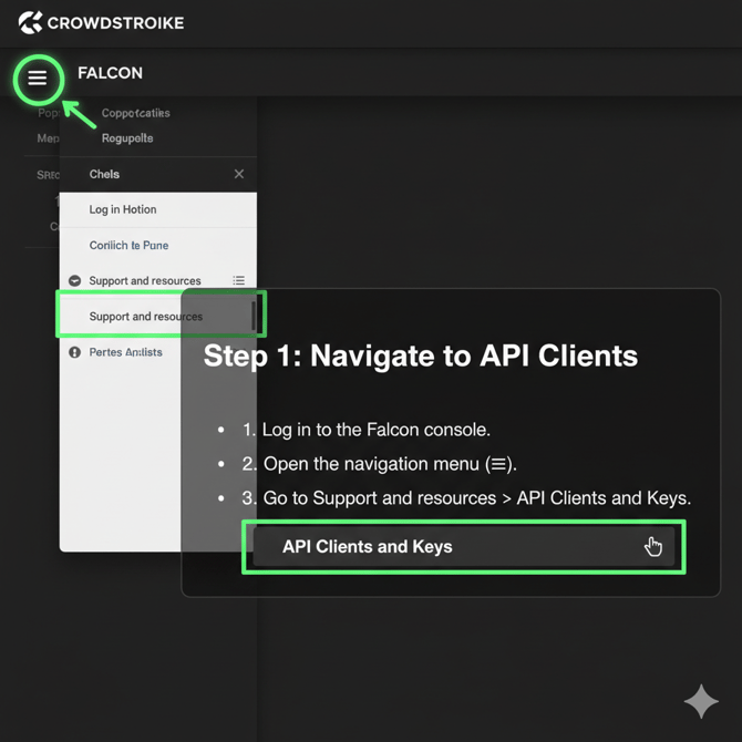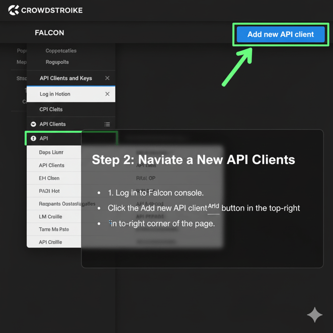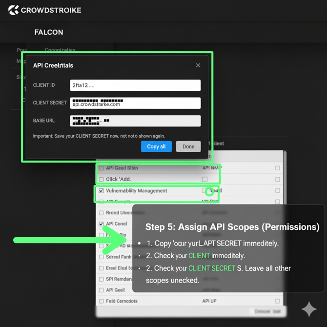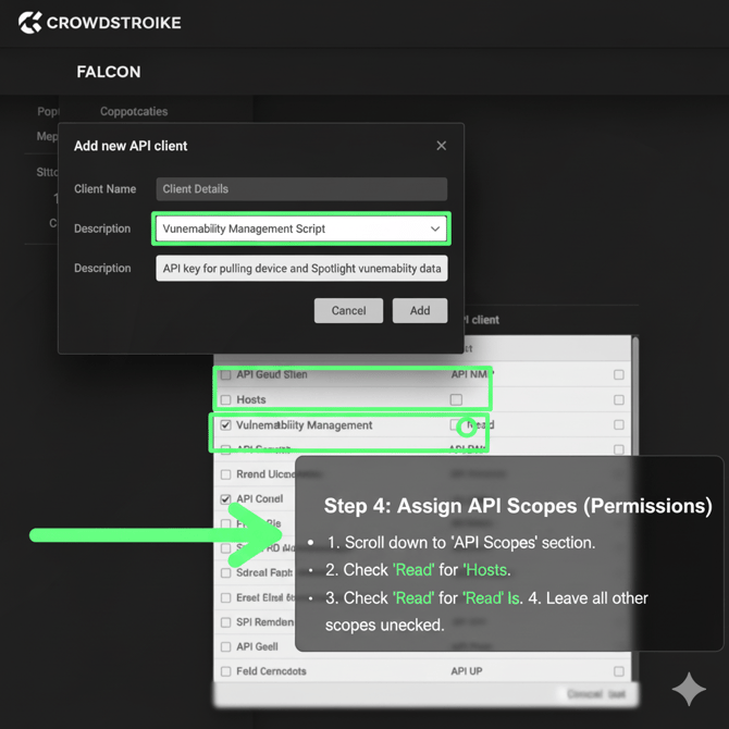 The process involves creating an API client in the Falcon console and assigning it the necessary Read permissions for the Hosts and Vulnerability Management scopes.